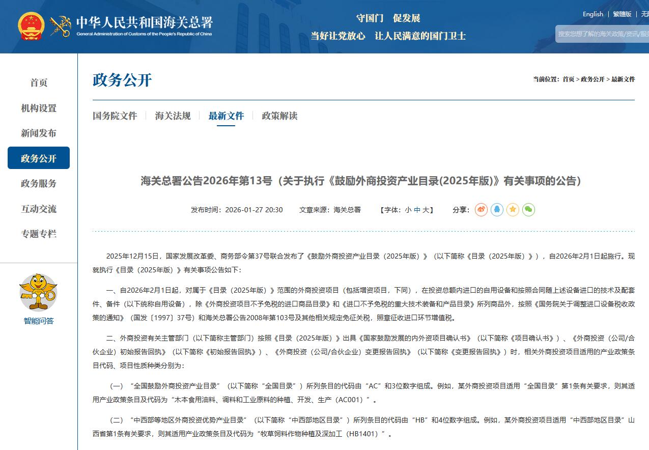 海關(guān)總署公告2026年第13號(關(guān)于執(zhí)行《鼓勵外商投資產(chǎn)業(yè)目錄(2025年版)》有關(guān)事項的公告)