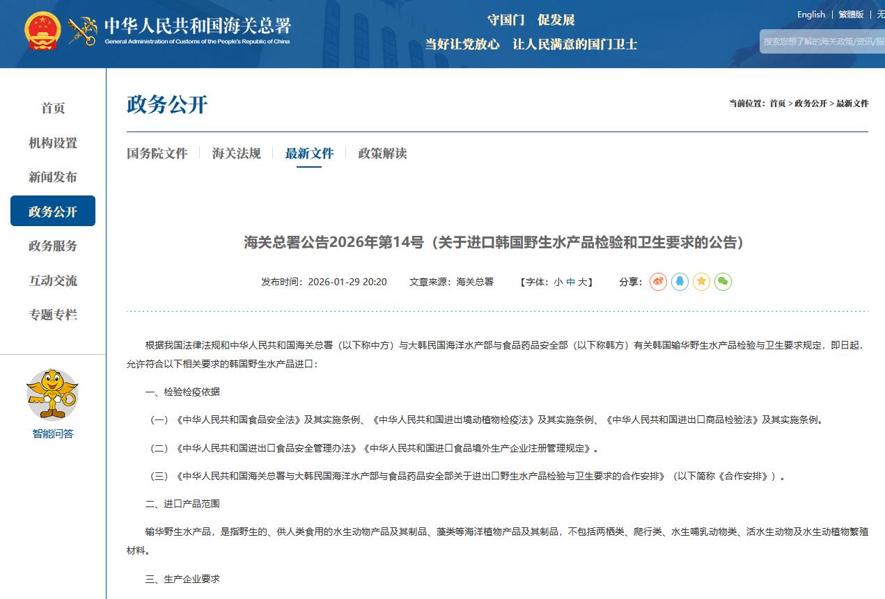 海關(guān)總署公告2026年第14號(關(guān)于進口韓國野生水產(chǎn)品檢驗和衛(wèi)生要求的公告)