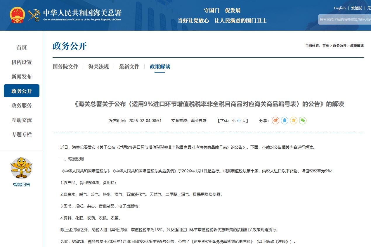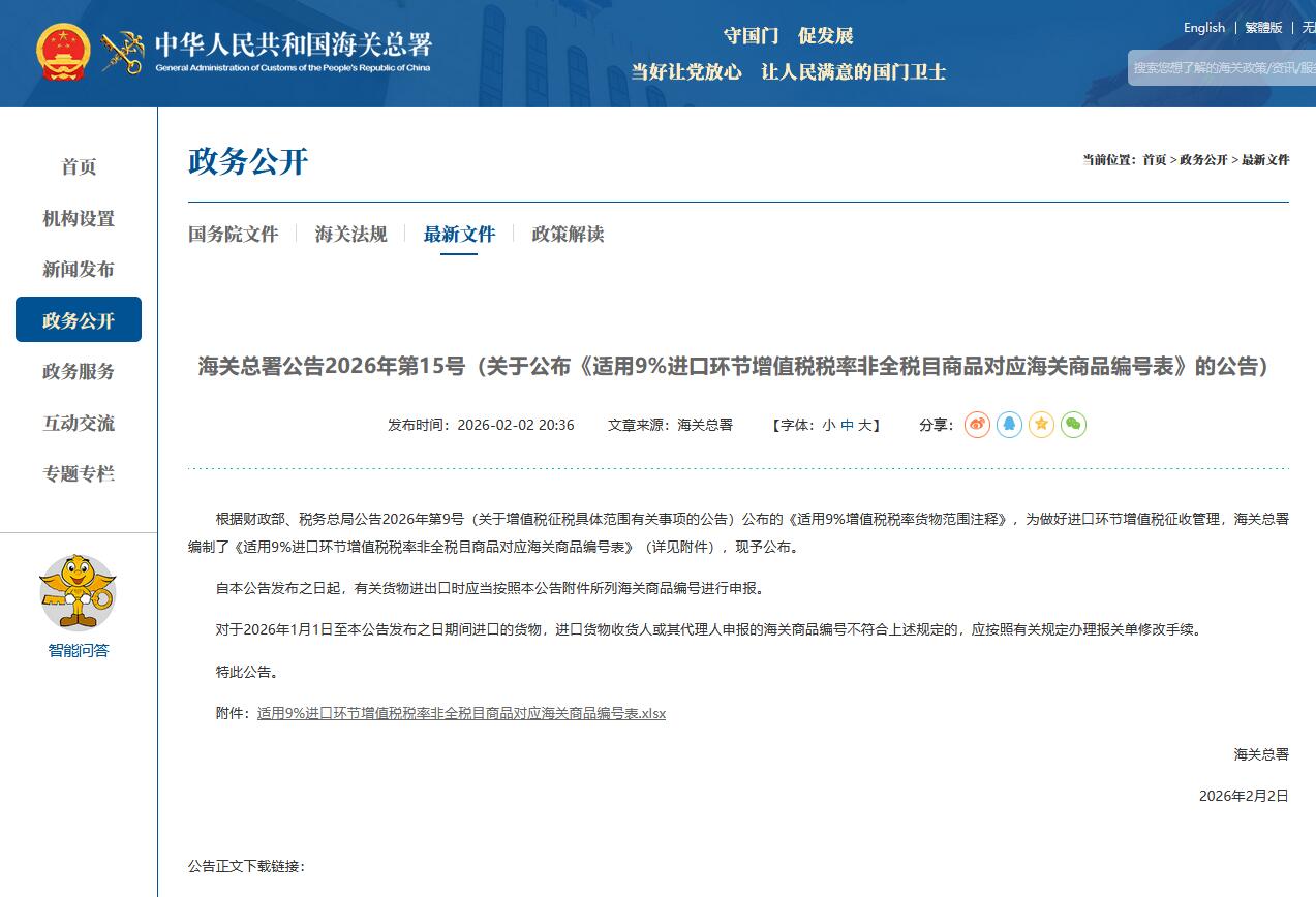 海關(guān)總署公告2026年第15號(關(guān)于公布《適用9%進口環(huán)節(jié)增值稅稅率非全稅目商品對應(yīng)海關(guān)商品編號表》的公告)