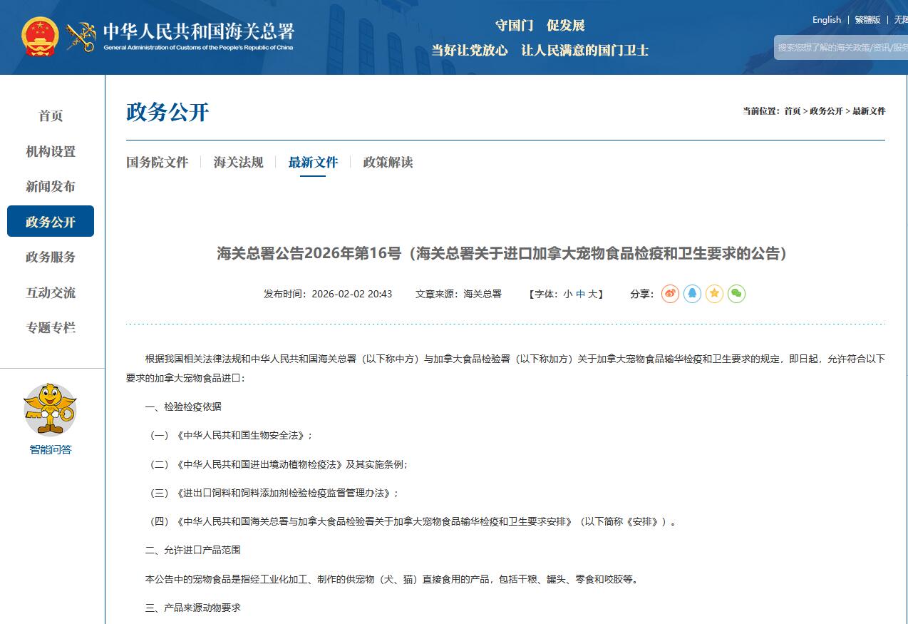 海關(guān)總署公告2026年第16號(海關(guān)總署關(guān)于進口加拿大寵物食品檢疫和衛(wèi)生要求的公告)